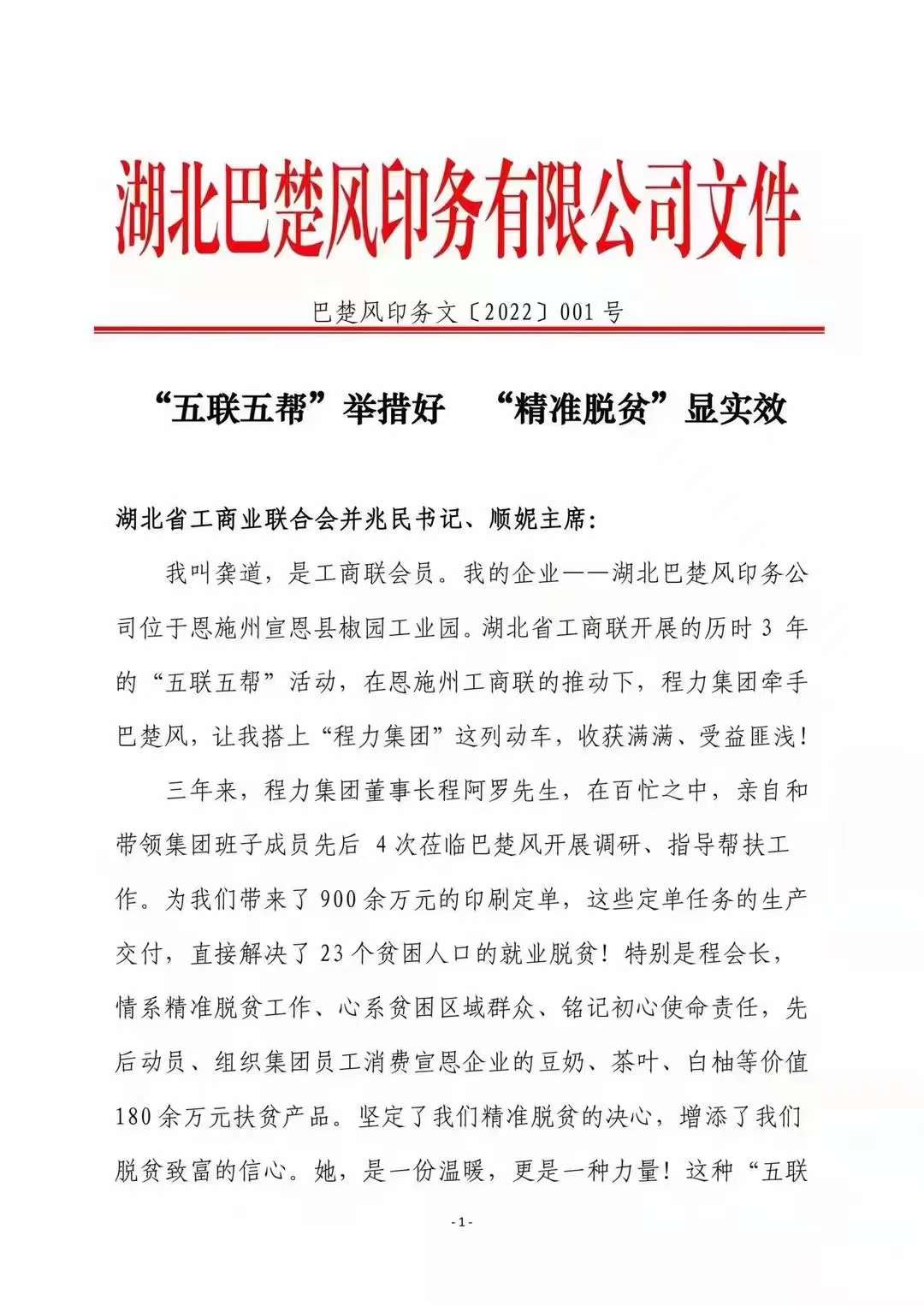 2022年元旦,程力集團收到第一份珍貴禮物:“五聯五幫精準扶貧”感謝信和錦旗,我們倍感欣慰與珍惜!近三年來,程力對省工商聯指定幫扶單位:恩施宣恩巴楚風印刷公司,不遺余力給與訂單和消費扶貧一千多萬元,還從對其公司管理、黨建、企業規范化運行等方面指導,幫助其企業走出困境,圓滿完成了脫貧攻堅任務。