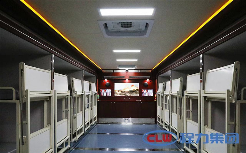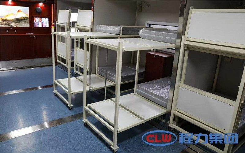 多功能宿營(yíng)車采用兩側(cè)擴(kuò)展設(shè)計(jì),擴(kuò)展后可使廂內(nèi)面積大幅度增加,每個(gè)床位還配備有微型照明燈。此外,車廂內(nèi)還配備空氣調(diào)節(jié)系統(tǒng)、影音系統(tǒng)、衛(wèi)生洗浴系統(tǒng)、安全防護(hù)系統(tǒng)、通風(fēng)換氣系統(tǒng)等,可滿足消防戰(zhàn)士24小時(shí)執(zhí)行任務(wù)和基本生活的需求。