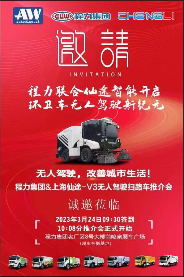 程力集團(tuán)攜手上海仙途智能科技有限公司,研發(fā)制造首款程力仙途-V3智能化無(wú)人駕駛掃路車,已量產(chǎn)上市。公司定于3月24日上午9:30-11:30,在程力老廠噴泉廣場(chǎng)現(xiàn)車拍攝基地,隆重舉行產(chǎn)品推介會(huì),參會(huì)嘉賓均有機(jī)會(huì)現(xiàn)場(chǎng)抽大獎(jiǎng),并領(lǐng)取精美伴手禮,一起見證無(wú)人駕駛環(huán)衛(wèi)車的高光時(shí)刻。
