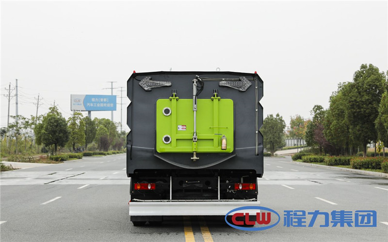 東風(fēng)天錦多功能洗掃車采用東風(fēng)天錦DFH1180EX8型國(guó)六二類汽車底盤改裝,加裝副發(fā)動(dòng)機(jī)、風(fēng)機(jī)、高壓水泵、清水箱、垃圾箱、左右立掃、帶噴水桿的寬吸嘴、低壓沖洗系統(tǒng)、掃盤降塵系統(tǒng)、液壓系統(tǒng)、專用裝置電控系統(tǒng)和副車架等改裝而成。清水箱充分利用了車載空間,容積大,容積達(dá)9m3。垃圾箱采用單層304不銹鋼結(jié)構(gòu),傾翻卸料,帶高壓自潔裝置。自潔裝置可在垃圾箱卸料時(shí)幫助卸料,清洗垃圾箱內(nèi)部。