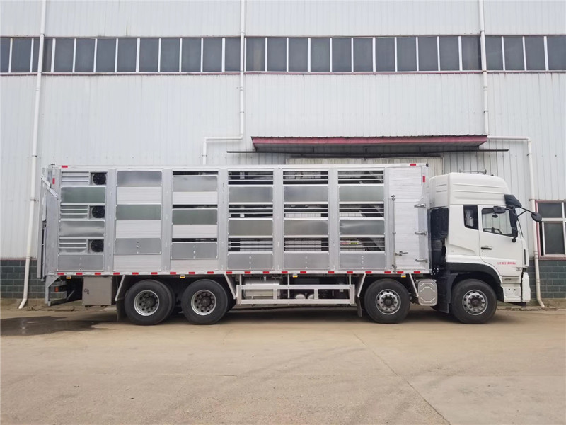 這款東風天錦小三軸30方散裝飼料車運輸時,頂部的螺旋管平臥在罐頂;卸料時則抬起,使管端的出料口與畜禽飼養場貯料罐頂部的進料門相接,駕駛室內裝有操縱裝置(操縱裝置也可裝置在罐體尾部),卸料時通過車底的動力輸出軸和減速器來驅動螺旋,以完成卸料。