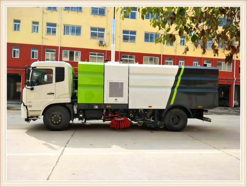 東風天錦掃路車洗掃車底盤配置東風經典天錦車頭,一排半可前翻駕駛室,東風經典雙飛燕大徽標LOGO,軸距4700mm,公告駕駛室標準乘坐3人,康明斯210馬力國六發動機,東風6檔變速箱,275真空胎,4.5T噸前橋,9噸加強型后橋,雙層大梁,帶方向助力,下防護,ABS,原廠空調。清掃裝置型式:中置四盤掃+后置吸嘴,掃盤可自動避障;掃盤具有3種作業模式:全掃、左前不掃、右前不掃,實現路面的清掃及吸塵。