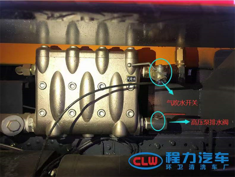 B.氣吹高壓泵的操作方法:車輛熄火后 ,關閉高壓泵進水的球閥,打開高壓泵排水閥開氣吹水開關,吹出高壓泵內殘水。