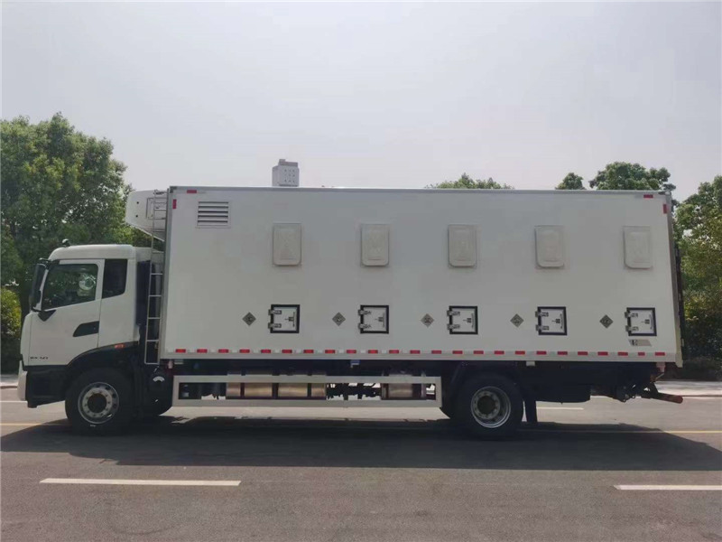 車廂結構:車廂前部有1.2米混合倉,配有5個鼓風機,裝有散熱蒸發器, 加濕噴霧器,車廂后部為雞苗存放處,車廂頂部,左右兩邊配有出風通道, 車廂內部配有八個環境溫度傳感器,和二氧化碳監測器,配有240V發電機。