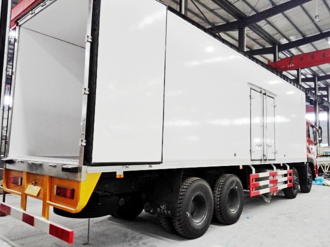 二、廂體配置:采用我公司液壓吸附一體成型生產(chǎn)線制造,保溫性能達到國家A級標準廂體內(nèi)部尺寸為:9400X2400X2450(mm)容積為55立方, 廂體內(nèi)外面料采用最新款納米玻璃鋼(不吸光、隔熱性好、硬度強、抗氧化),廂體厚度為8cm,內(nèi)襯骨架為防銹處理武鋼優(yōu)質(zhì)輕鋼型材,保溫材料為無空隙填充聚氨酯發(fā)泡,廂體底部為鋁合金花紋板或選平面納米玻璃鋼,廂體采用鍍鋅不銹鋼包角,加厚型鋁合金包邊,后門框為不銹鋼,加厚型不銹鋼后門合頁及鎖件,廂體內(nèi)部采用LED照明燈及廂體示寬燈。