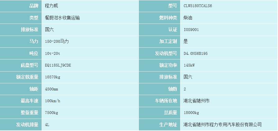 介質:餐廚垃圾,密度:800千克/立方米,罐體有效容積:8.13立方米,罐體外形尺寸(直段長×直徑)(mm):3800×1600。該車右側面配備垃圾上料裝置,用于作收集餐廚垃圾。防護材料:Q235A碳鋼,連接方式:左右側面及后下部防護均采用焊接連接,后部防護斷面尺寸(mm):120×50,后部防護離地高度(mm):400。 ABS系統型ABS/ASR-24V-4S/4M,ABS系統生產廠家襄陽東風隆誠機械有限責任公司。此整車長/軸距對應關系為(mm):6850/3800,7000/3950,7100/4050,7150/4100,7450/4400。當軸距為(3800mm,3950mm)時,整備質量為5600kg,當軸距為(4050mm,4100mm,4400mm)時,整備質量為6400kg。
