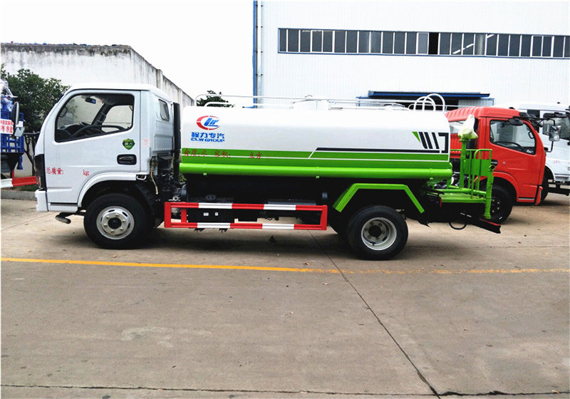 專用配置:罐體容積 5立方,罐體采用國標Q235碳鋼材質,新式工藝罐體,罐體厚度4MM,前后封頭5MM加厚型,罐體內雙層隔板具有防波蕩作用,以減輕汽車行駛時罐內液體沖擊;灑水車整車及外形尺寸嚴格按照國家機動車公告制作而成;裝配大功率專用灑水泵,前沖、后灑、側噴、后平臺帶消防式灑水炮,灑水炮可全方位旋轉,可連續調成直沖狀、大雨、小雨、毛毛雨;配消防接口,自流閥,濾網,帶自吸自排功能。前封頭帶水位計,后平臺主管路帶1寸澆花接口,后爬梯,帶1個消防接頭,帶1個自流閥,1個過濾裝置,其余標配。1、可選裝后平臺帶霧炮機組用于噴霧降塵、農藥噴灑作業;2、可選裝前置電子灑水炮駕駛室操作;3、可選裝氣動球閥駕駛室操作。