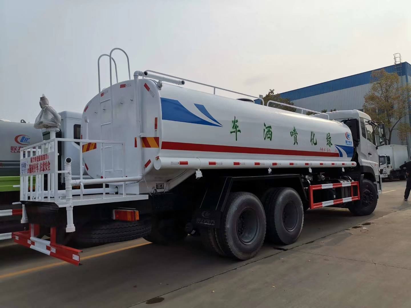 罐體實(shí)際容積20m3,采用Q235碳鋼板制作,5mm厚,封頭6mm厚,內(nèi)部隔浪板,防止罐體內(nèi)液體在緊急剎車(chē)或快速起步等運(yùn)動(dòng)中對(duì)封頭產(chǎn)生沖擊,引發(fā)危險(xiǎn)。配罐口蓋,帶后爬梯;管道及球閥;帶泵,80QZ-60/90自吸式水泵,流量為60m3/h,揚(yáng)程為90米,垂直吸程為10米,配備消防接口,可在消防接口取水,放水方式有兩種,自流口自排和泵加壓排水,帶兩根橡膠軟水管,快速接口。整車(chē)顏色為上白下藍(lán)本色,駕駛室顏色有紅色和白色可選,罐體顏色可按客戶要求噴色或貼印圖案Logo。