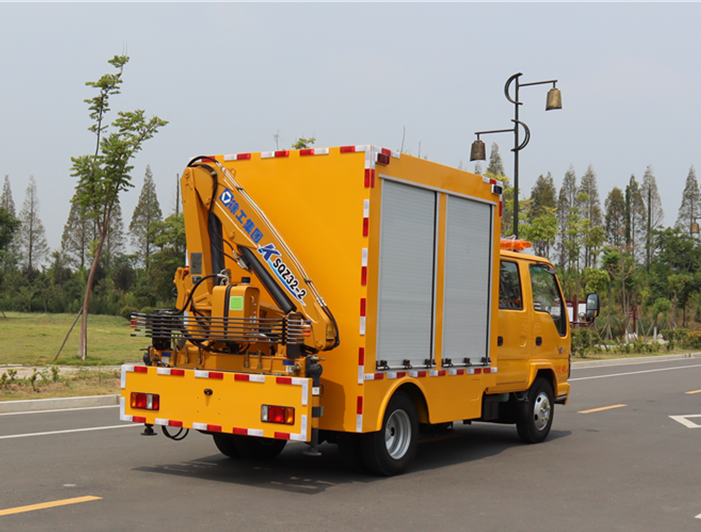 車輛尾部安裝2噸徐工折臂吊機,最大額定起重質量:2000Kg,車輛兩側都可操作吊機工作。帶2個液壓支腿。