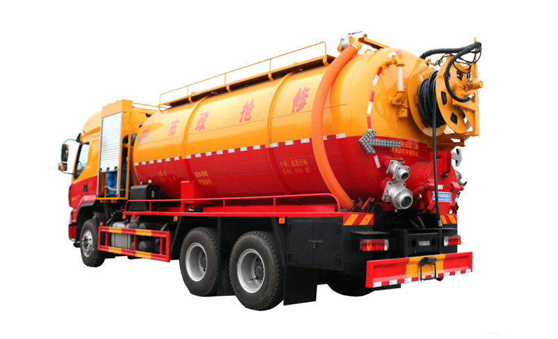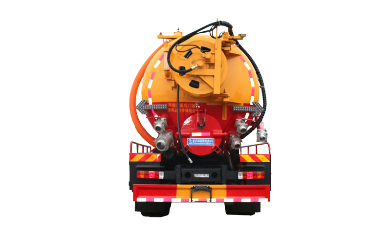 水罐污罐內封頭隔斷。清水罐兩側一邊一個消防栓進水口(副駕駛一側直通罐頂),兩側安裝量管、安裝小球閥放水。清水罐底部一個65方形排水閥。清水罐頂一個排氣閥。兩個三爪罐口(清水罐一個,污水罐一個)。清水罐、污水罐內部安裝爬梯。視糞窗(安裝圓球閥),兩倉互通。污水罐體內鋪不銹鋼薄板,罐體尾部一個700液壓開蓋,罐體兩側平臺用花紋板圍邊,平臺做滿。罐后封頭左側球閥1個6寸150球閥和4個寸的自流一個,600液壓門,右側4寸100鋁合金進料口。寸自流口后不開大門。體副駕駛后部一個150不球閥側排。清水罐、污水罐互通。平臺罐頂部兩側防滑平臺和護欄,后封頭一個視污管(安裝圓球閥),罐頂抽氣管加一個球閥開關,里面安裝自制防溢流閥。雙耀品浮315流量高壓泵,氣吹水,100米25高壓管,選裝濰柴420副發,后封頭液壓卷盤折疊、伸縮。后尾部封頭裝箭頭燈。M型保險杠(兩邊封口),安裝大工具箱,按照客戶提供圖片制作,其余廠內標配。