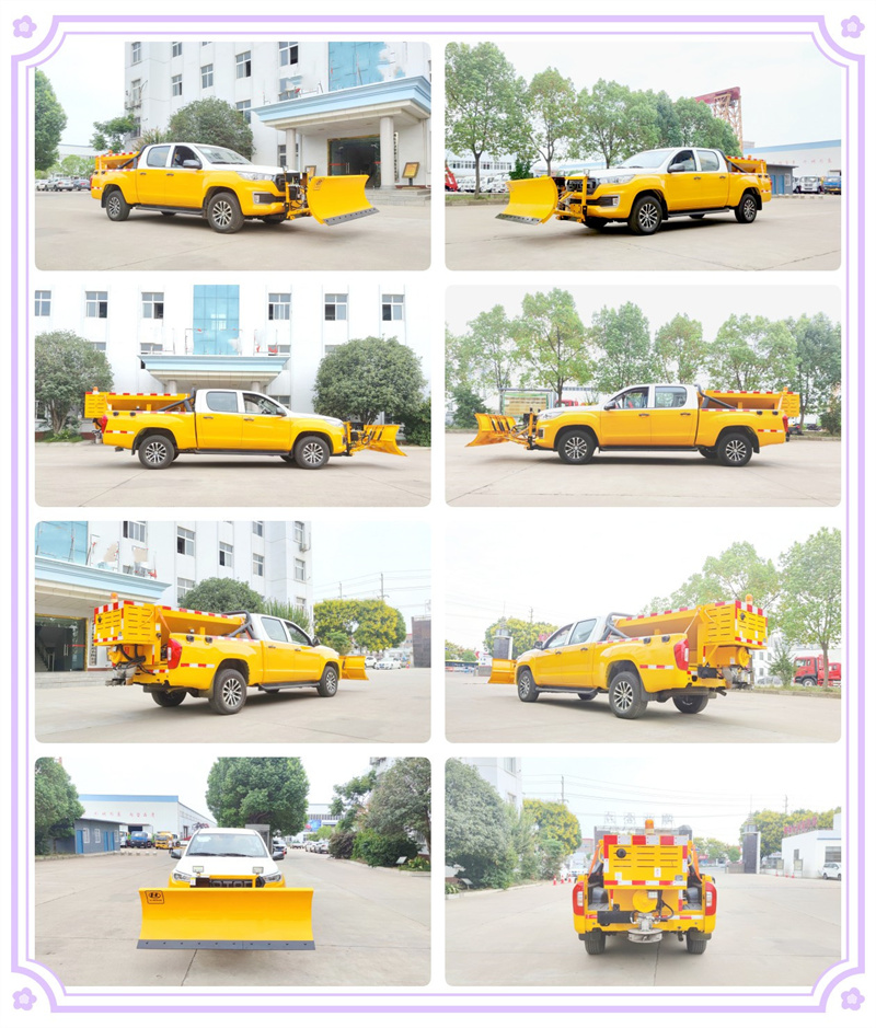 該皮卡除雪車適用于現代城市、高速等路段除雪、融雪、掃雪及破冰的專業化運輸與作業車輛,該車前置除雪鏟、掃雪滾刷互換使用,積雪厚時用掃刷將其掃至馬路兩側,或用推鏟把結冰的積雪推至馬路兩側。后置融雪撒布機,除雪的過程中,撒布機拋灑融雪劑,防止濕滑的路面結冰影響交通,使車輛安全通過。